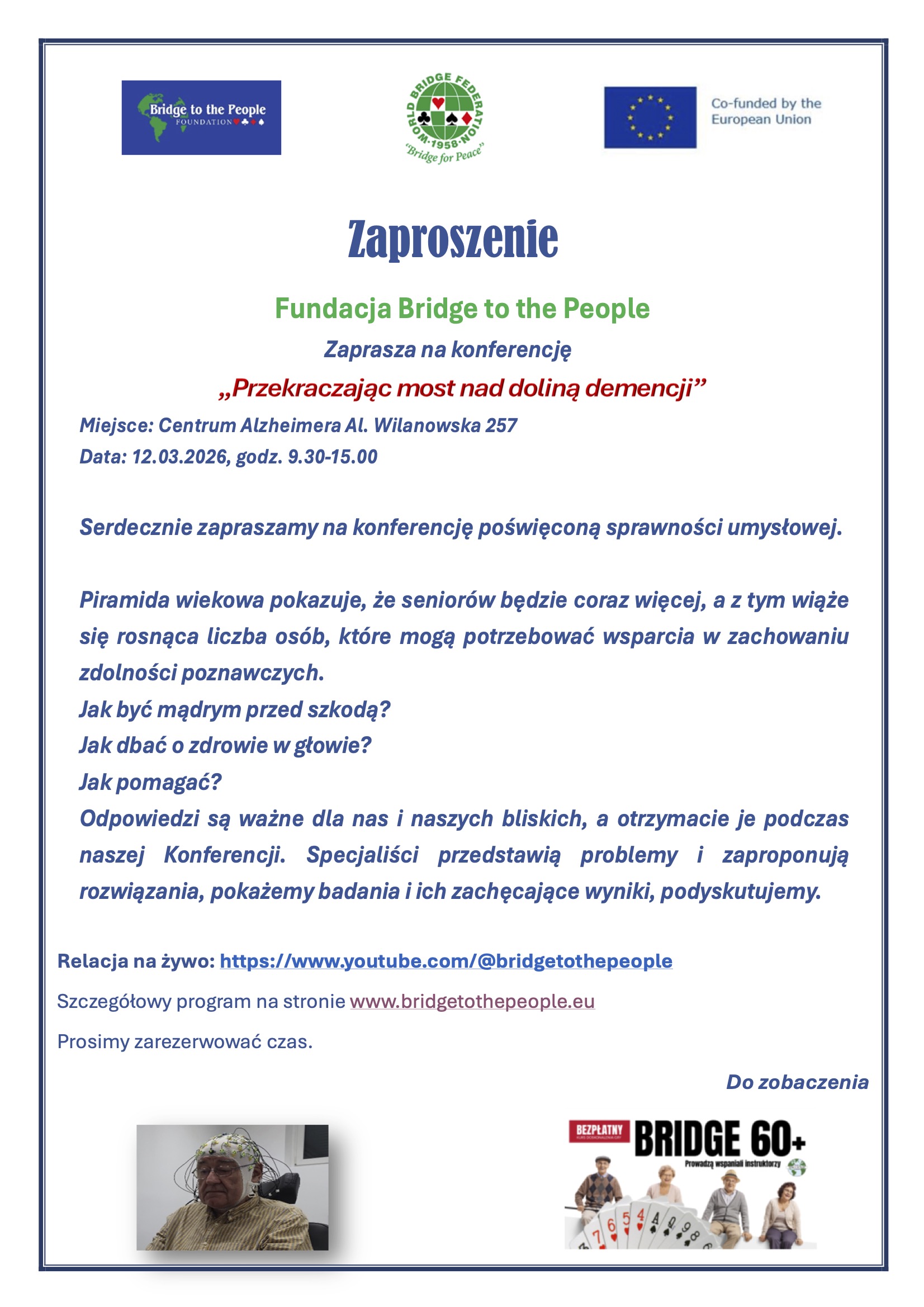 Całość transmitowana będzie w dwóch wersjach językowych na kanale You Tube Fundacji: https://www.youtube.com/@bridgetothepeople
